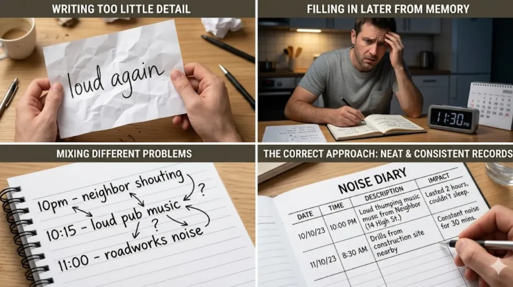 One common mistake is writing too little detail. A note like “loud again” does not tell the council much about duration, timing, or impact. Another mistake is filling the diary in days later from memory, which can make times and descriptions less reliable.