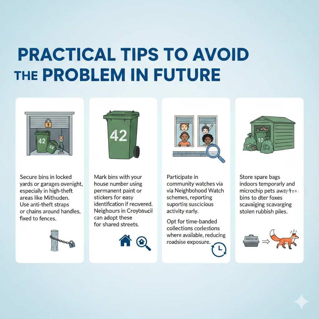 Mark bins with your house number using permanent paint or stickers for easy identification if recovered. Neighbours in Croydon council or Greenwich can adopt these for shared streets.