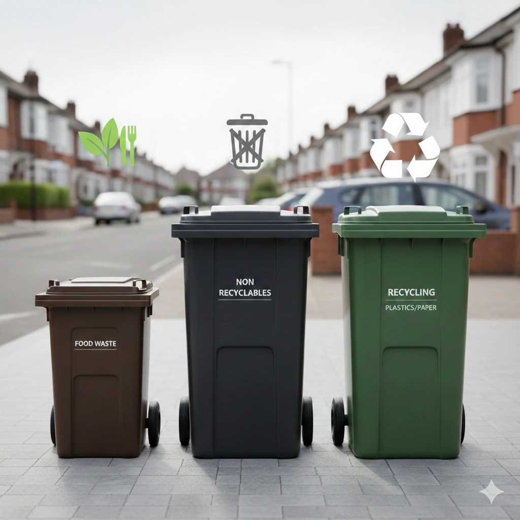 General black refuse bins hold non-recyclables; green or blue for plastics/paper. Food waste caddies are smaller but equally replaceable.