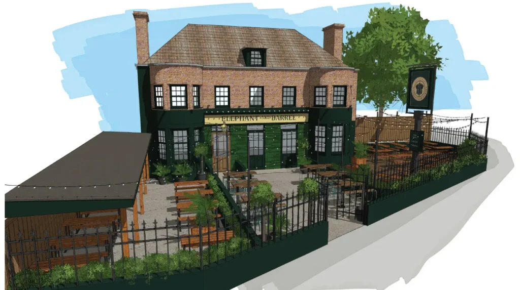 The Stockwell Elephant and Barrel’s large outdoor space is ideal for the giant intstagrammable robotic elephant, which will be decorated with an English flag and jersey for the World Cup.  Also outside will be a bar with six beers on tap and a food truck with a rotating menu of dishes including pizzas, jerk chicken, chicken tikka and seasonal specials. There will be outdoor seating for 198 at benches and tables with new high-level seating and festoon lighting.  The exterior is being redecorated in a rich dark green and a new low wall with railings erected to demarcate the boundary.